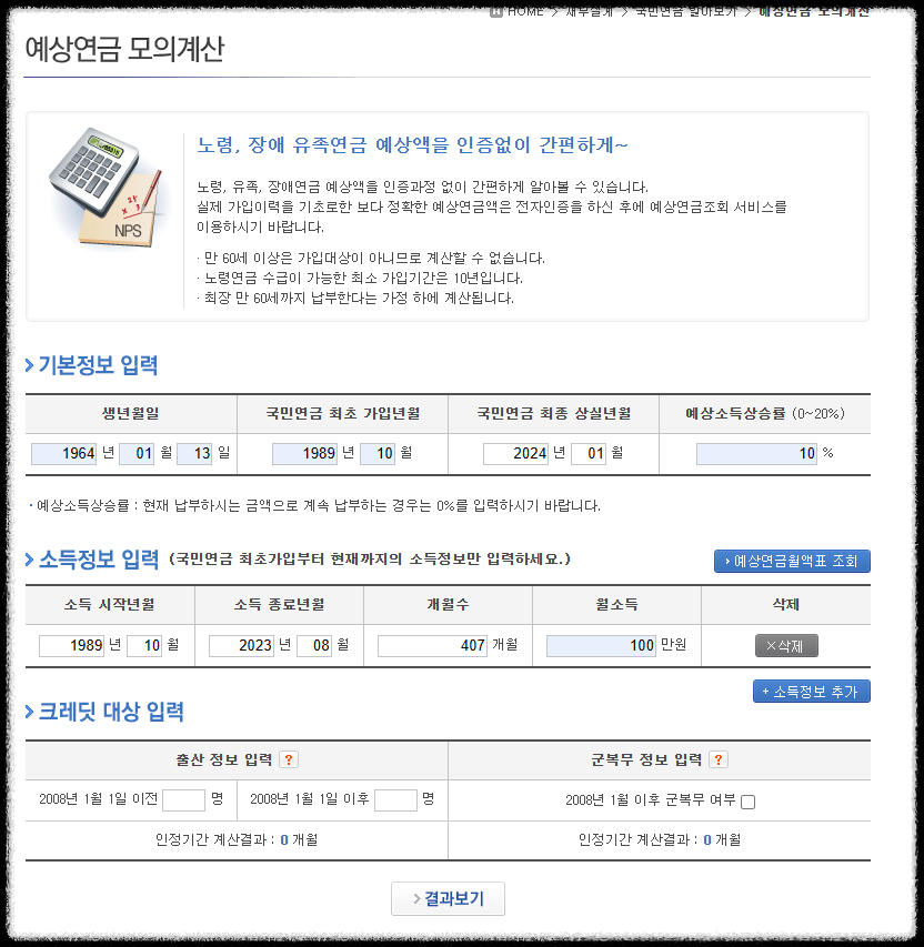 예상연금 모의계산으로 나의 노령연금을 조회해 볼 수 있습니다.
