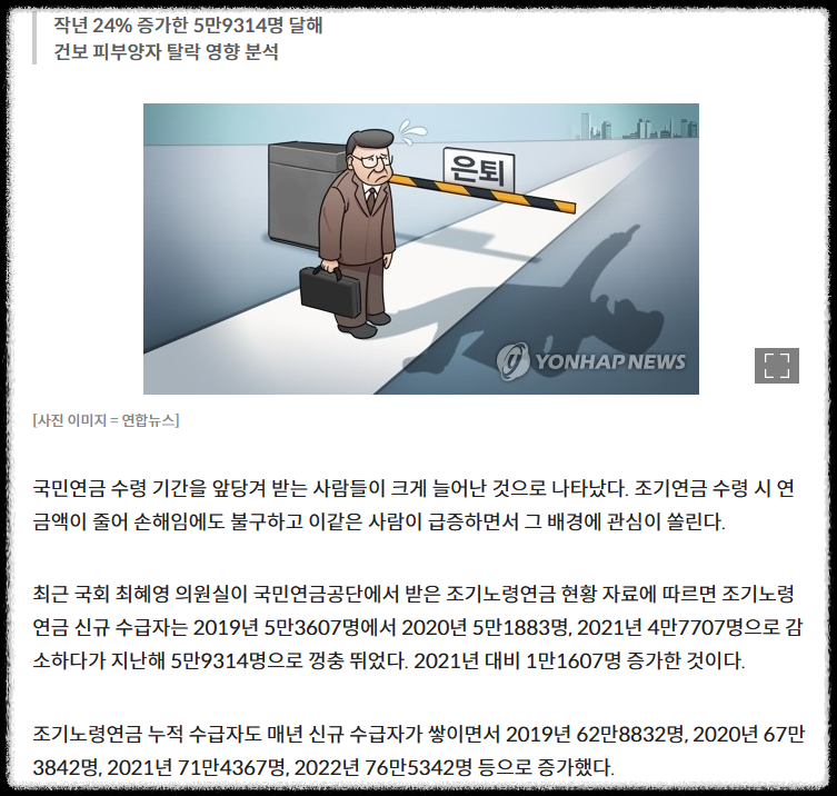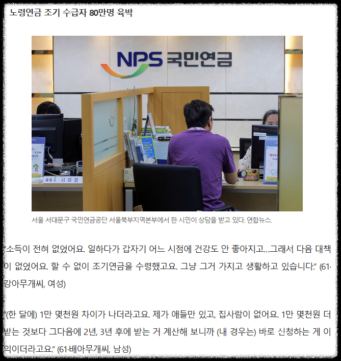 국민연금 조기수령조건은 가입기간 10년 이상 만 55세 이상이면서 만 60세 미만이며, 소득이 없다면 연금을 조기수령할 수 있습니다. 경기가 안 좋아지면서 연금을 미리 조기수령하려고 하시는 분들이 80만 명에 육박한다는 기사도 나와 있습니다. 빠르게 국민연금 조기수령 신청방법에 대해 알아보도록 하겠습니다.