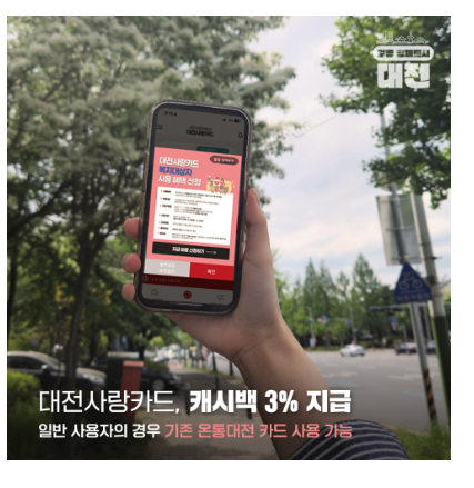 대전시는 대전사랑상품권에서 ' 대전사랑카드'로 변경된 대전시(삭제) 지역사랑상품권을 5월 1일부터 발행하고 3% 캐시백을 지급한다고 밝혔습니다. 대전사랑카드는 월 구매한도는 30만 원이고, 캐시백은 5월 ~ 6월 , 8월 ~11 월등 6개월 동안 3%을 지급합니다. (복지대상자 한해 연매출 5억 원 이하 가명점을 사용할 땐 캐시백 10%)