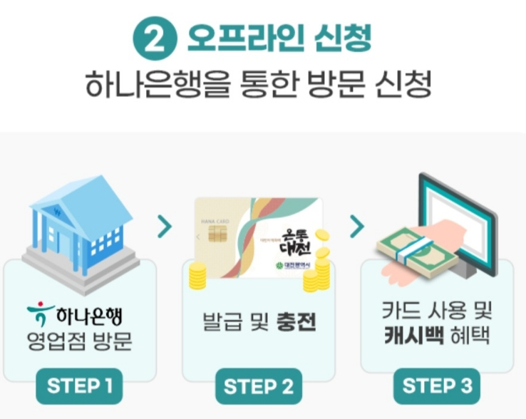 오프라인 신청방법은 하나은행을 방문하셔서 발급 및 충전하시고 사용하시면 됩니다.
