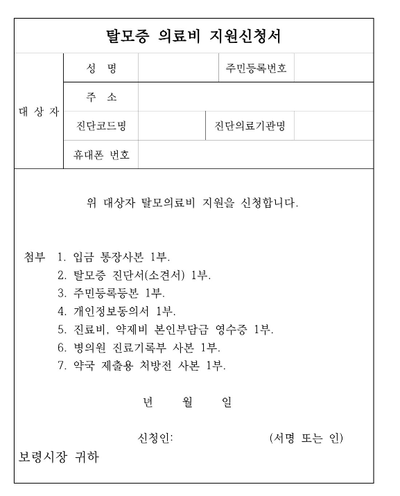 - 지원신청서, 개인정보동의서, 통장사본, 주민등록등본, 탈모증 진단서(처방전), 진료기록부 사본, 약국 제출용 처방전, 진료비(약제비) 영수증이 필요합니다.