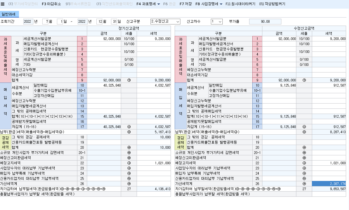 위에 신고내역(왼쪽) 기존의 신고, 오른쪽은 수정신고서 작성입니다.