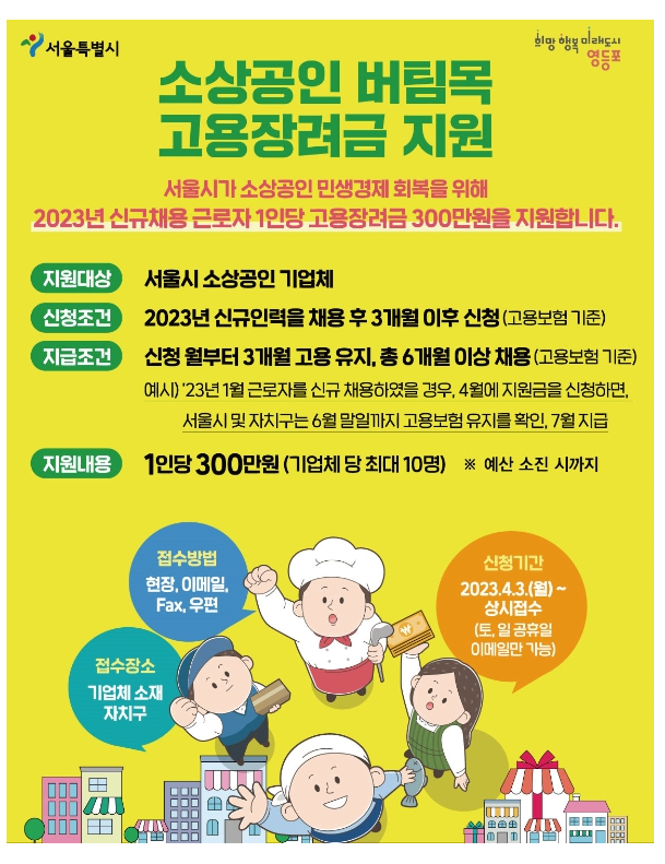 소상공인 버팀목 고용장려금 사업은 서울시 소재 소상공인 사업주가 2023년 신규인력을 채용하였을 경우