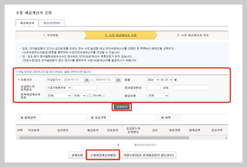 상호명 혹은 발급일자를 설정하고(조회하기)를 누르면 설정한 옵션에 해당되는 전자세금계산서 목록이 조회됩니다. 수정하고자 하는 전자세금계산서를 선택하고 수정세금계산서 발급을 눌러주세요.