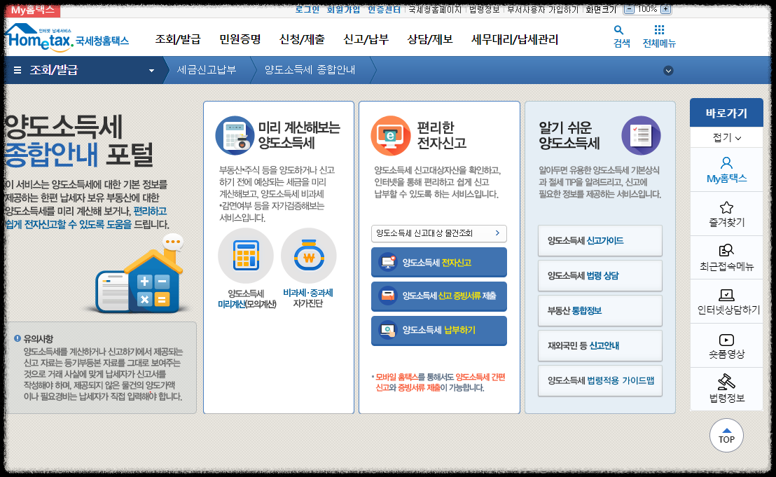 1. 국세청 홈텍스로 접속 > 양도소득세 > 양도소득세 미리계산을 눌러주세요.
