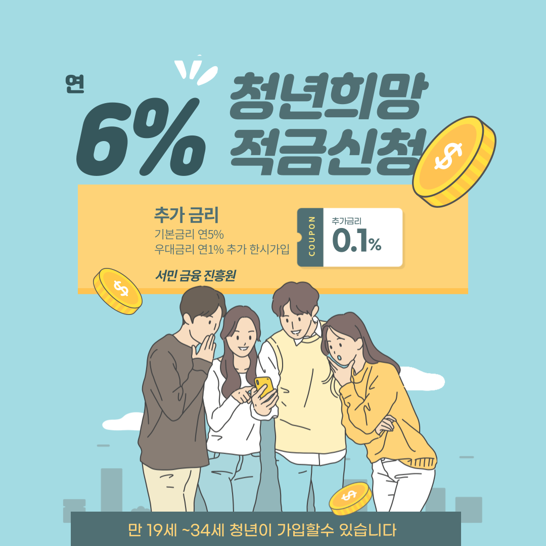 청년 희망적금은 만 19~34세의 총 급여소득 3,600만 원 이하에 해당하는 자, 종합소득금액 2,600만 원 이하에 해당돼야 가입할 수 있습니다. 매월 50만 원을 만기까지 납입하면 시중이자 최대 6%, 저축 장려금까지 추가로 지원받을 수 있습니다.