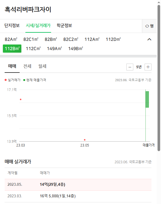 전용 84 타입에 2023년 3월이나 5월 실거래가를 보면 14억~16억 5천에 거래되어 6억 이상의 시세차익을 볼 수 있습니다.