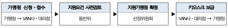 - 신청방법 : 지원을 희망하는 가맹점은 수행기관 신용카드(VAN사 ·대리점)를 통해 신청서를 접수하고, 해당 수행기관에서 이메일 (sccd@win- win.or.kr)로 신청서류 일괄 제출 (인터넷 지원 방법 없음)