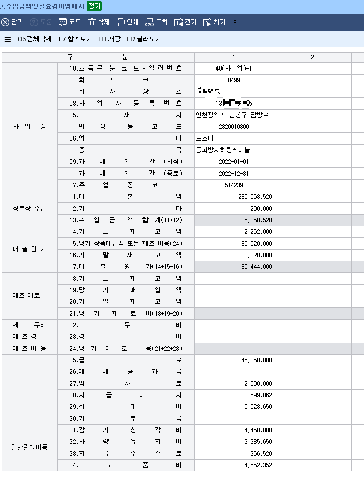 재무제표제출 (재무상태표, 손익계산세, 원가명세서, 합계잔액시산표 ) 작성해야 합니다