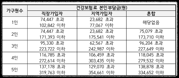 - 보건복지부 고시 가구 기준중위소득 150% 이하인자 (중위소득 50% 초과 ~ 150% 이하여야 하며, 2개월 동안 사업신청에 포함된 가족구성원의 건강보험료 부과액 합계 평균으로 산정)