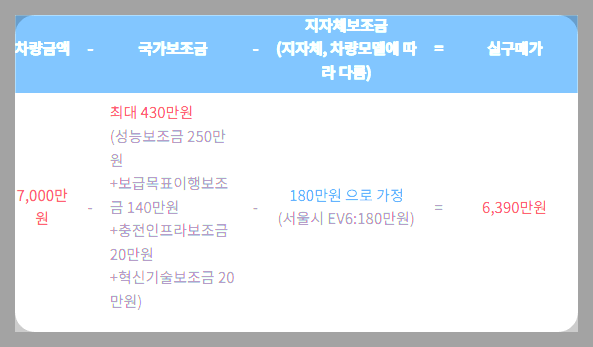 따라서 지자체 보조금을 180만원으로 가정하면 총 지원되는 보조금은 610만 원 (430만 원 + & )이 되고 실구매가는 6,390만 원이 됩니다.